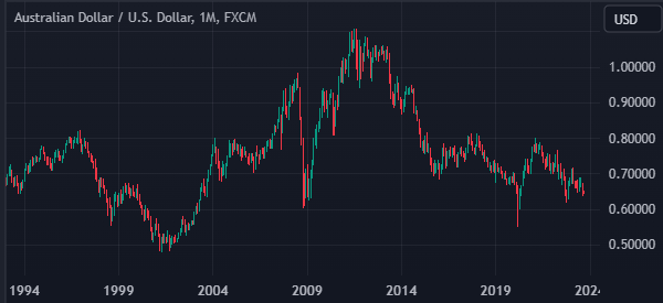 China also impacts the Australian dollar because of the volume of goods it sells. The chart below shows that the Aussie dropped in 2023 as the Chinese recovery faltered.