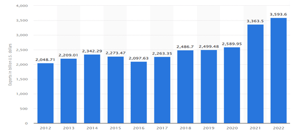 China is the biggest exporter and importer in the world. In 2022, the country exported goods worth over $3.5 trillion. As shown below, its exports have been in a strong upward trend over the years.